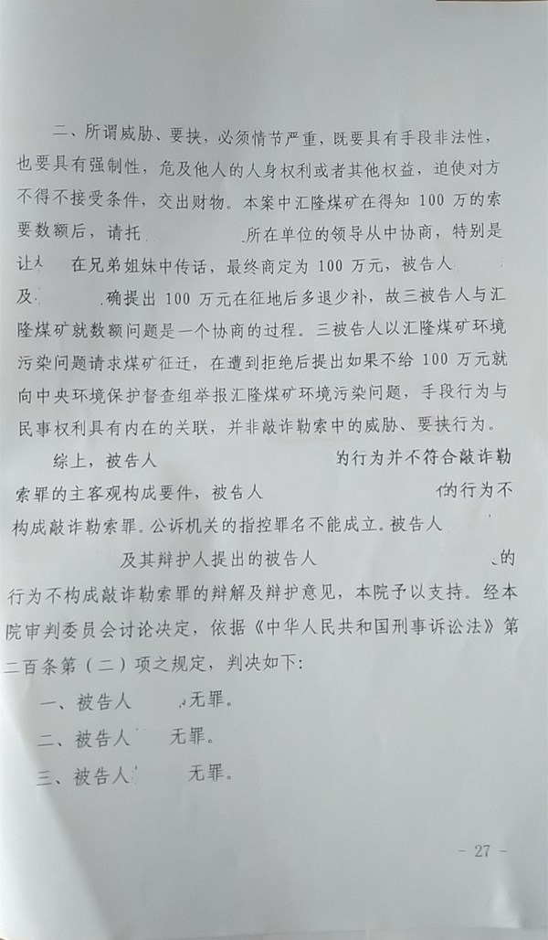 达拉特旗人民法院认为,敲诈勒索罪是指以非法占有为目的,对被害人使用威胁或要挟的方法,强行索要公私财物的行为。一、关于敲诈勒索罪的主观方面。被告人杨某一、杨某二、杨某三的母亲居住于某煤矿一号排土场(原南2号排土场)南侧,测量报告显示排土场顶点至其母亲家距离137.46米,排土场底部中点至其母亲家距离76.44米。某煤矿曾因污染问题引发上访被上级公司处罚,且因存在扬尘、震动污染对西阳坡社村民进行了补偿。鄂尔多斯市人民政府关于中央环境保护督查回头看群众举报案件办理情况的函载明排土场及周边500米范围内的居民进行搬迁。三被告人了解到上述函件且在某煤矿存在污染的情况下向某煤矿主张征迁其母亲的房和地,在征迁无果后向某煤矿索要100万元,虽然数额特别巨大,但是基于民事争议而提出,无法认定三被告人主观上具有“非法占有目的”。二、所谓威胁、要挟,必须情节严重,既要具有手段非法性,也要具有强制性,危及他人的人身权利或者其他权益,迫使对方不得不接受条件,交出财物。本案中某煤矿在得知100万的索要数额后,请托杨某一、杨某二所在单位的领导从中协商,特别是让杨某二在兄弟姐妹中传话,最终商定为100万元,被告人杨某一及杨某三明确提出100万元在征地后多退少补,故三被告人与某煤矿就数额问题是一个协商的过程。三被告人以某煤矿环境污染问题请求煤矿征迁,在遭到拒绝后提出如果不给100万元就向中央环境保护督查组举报某煤矿环境污染问题,手段行为与民事权利具有内在的关联,并非敲诈勒索中的威胁、要挟行为。